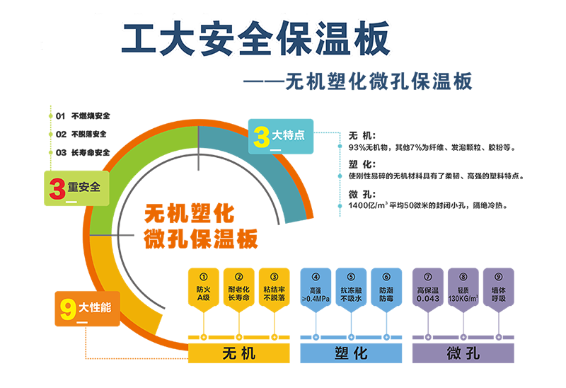 無機塑化微孔保溫板密度約130kg/m3,抗壓強度≥0.40MPa,解決了保溫材料”低密度和高強度難于一身“的技術(shù)難題。